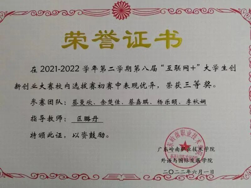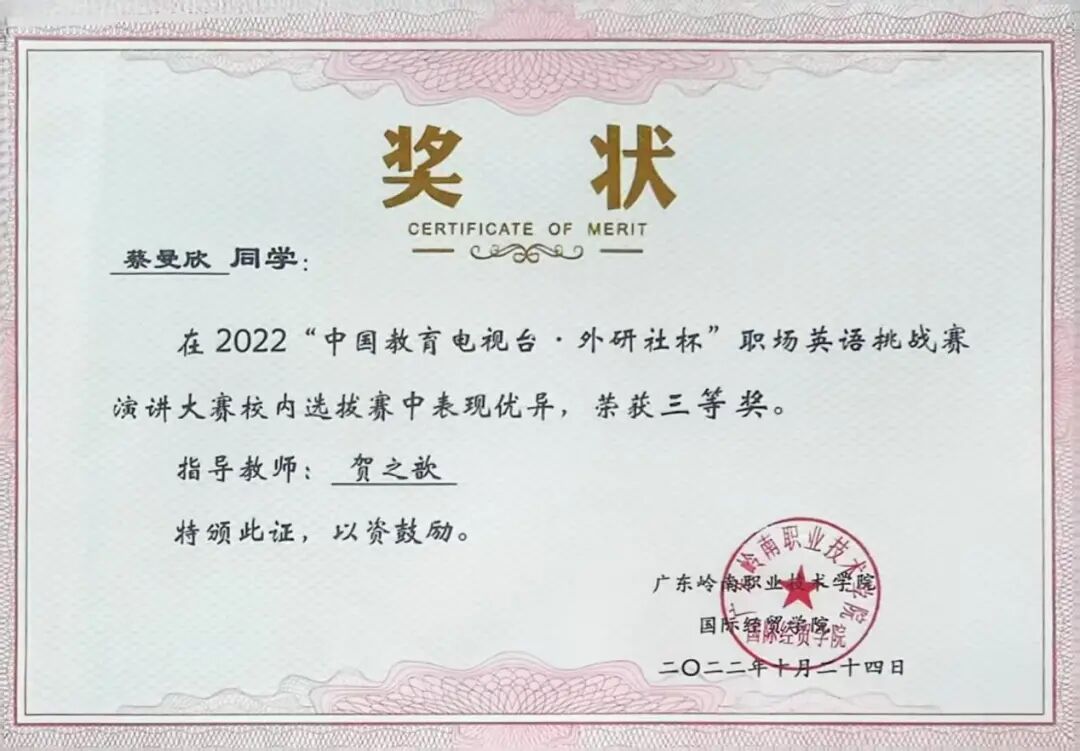 2020年,蔡曼欣进入广东岭南职业技术学院应用英语专业就读。她深知高职学历并非终点,而是奋斗的起点。只有打牢扎实的专业基础和能力,才能在就业市场上游刃有余。当有些人忙着享受校园每个角落的时候,她则是在宿舍、在图书馆窝着,疯狂地刷着模拟卷试题,猛攻自己的薄弱知识点、背作文模板,跟着磨耳朵视频练习英语听力。很快,她四六级都一次性过了,顺利拿到证书。为了备战计算机一级考试,她制定了严格的刷题计划。每天雷打不动练习1小时,反复操作Word文档排版、Excel表格制作和PPT演示设计。把易错题整理成错题本,针对薄弱环节加练,直到每个操作步骤都烂熟于心。最终她成功拿下了计算机证书,还获评“优秀毕业生”。逐渐,她成为了同学中“跑得最快的学生”。